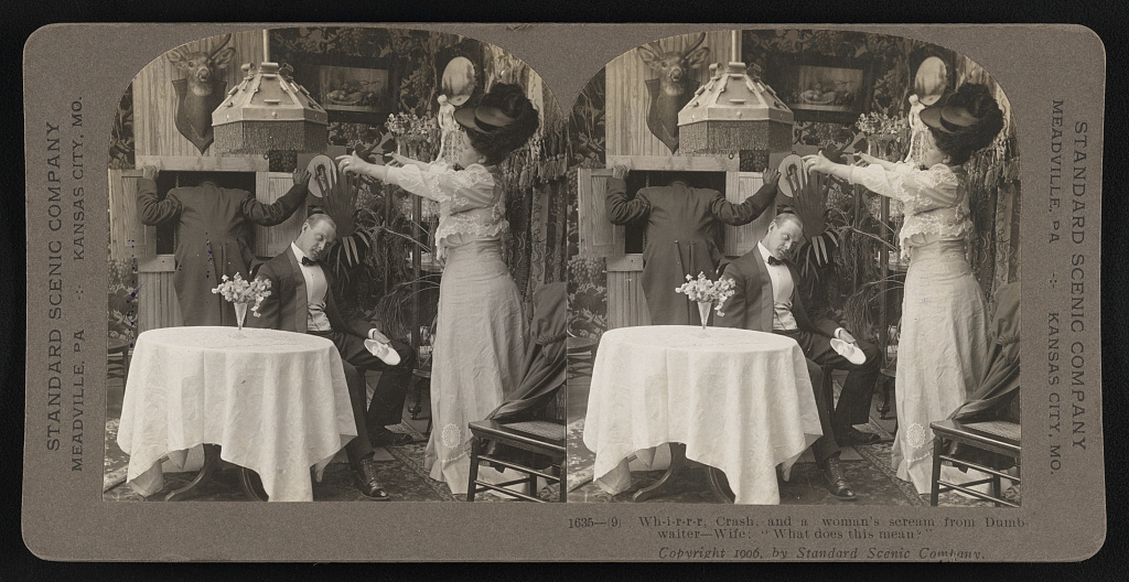 “Wh-i-r-r-r, Crash, and a Woman’s Scream from Dumbwaiter—Wife: ‘What Does This Mean?’” Standard Scenic Company, “Stereographs of American Life and Humor.” ↩