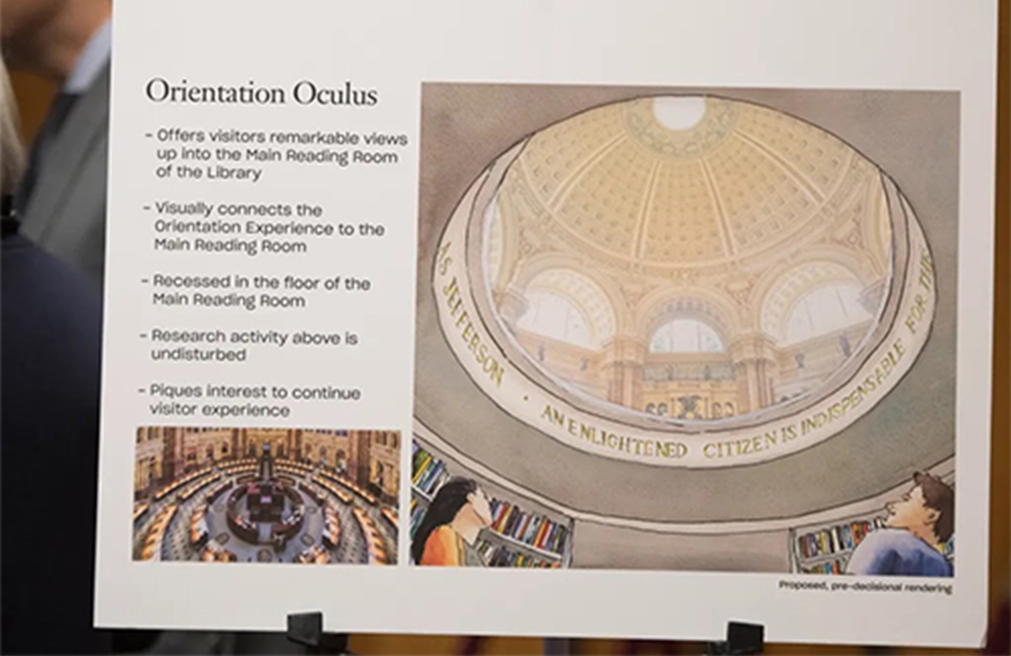 In July of 2022, the Library of Congress Professional Guild warned that the dumbwaiter, along with the central circulation desk and control room, was at risk of removal.50 According to a plan to reconfigure the control room occupied by the library staff into an orientation space for visitors, the existing furniture and equipment would be replaced by an “oculus” through which visitors could view the Main Reading Room’s dome from the floor below.51 The change was first proposed in the Library of Congress’s 2018 Visitor Experience Master Plan and confirmed in the library’s 2023 Budget Justification.52 With a $60 million budget and the Architect of the Capitol’s support, the “Orientation Gallery / Welcome Area / Oculus” project underwent preliminary design development.53 Drawing sets were produced and construction was at one point scheduled to be completed in fall 2025.54 The library’s initial vision was made public during a 2019 presentation by the Librarian of Congress, Carla Hayden. Entering from street level, Hayden explained, visitors will arrive at the Orientation Space to view “[the Reading Room’s] arched stained glass windows, domed ornamental ceiling, balustrade of galleries above the alcoves, and some of the major figures who contributed to civilization” through the oculus.55 The designers hope that the spectacular view will inspire visitors to “have a better understanding of democracy in action, appreciate what it means to be a good citizen,” and see “Jefferson’s Library as the foundation of the Library.”56 (The proposal was scrapped in November of 2022 due to budget and fire safety concerns.57)