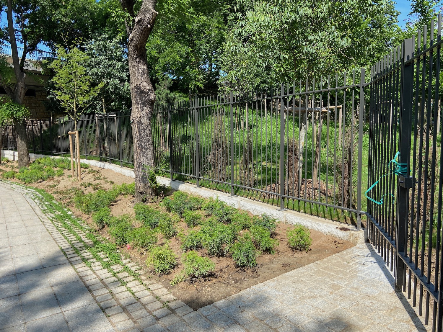 How, then, does this mechanization of urban nature play out in the shapes of contemporary tree planting and its relationship to queer life? Partially in the spatial distribution of new planting in Paris, and partially in the ways it attempts to keep trees out of reach of those who might inhabit them in the “wrong” ways. Almost 50 percent of the 114,000 trees planted so far are on the embankments of the Péripherique ring road that tightly hugs the inner city, separating it from the sprawling suburbs. Though these embankments butt up against housing and public spaces, they are fenced off, inaccessible to human bodies (other than those performing their maintenance), to be touched only by the eyes from within vehicles skirting the city via the ring road. Like the embankments themselves, which are part of the infrastructural substrate of mobility, these trees form part of the network of inaccessible systems that underpin the motorway, solutions for managing air and noise pollution in order to better integrate it into the lived fabric of the city. In these buffer spaces, trees can be planted densely without fear of inviting the kind of uses drawn to the non-straight spaces of the woodlands. Furthermore, as Céline Baumann describes, trees themselves act “queerly” when they refuse to be “compliant” with the public order, flamboyantly shedding rotting fruits, flowers, and leaves.18 The City of Paris, it seems, has capitalized on the opportunity provided by the embankments to meet its tree-planting goals without disrupting the social geometries of Paris’s streets and squares. The City of Paris has planted a dense cluster of trees on the infamous colline au crack (“Crack Hill”) as part of a policy to green the surroundings of the Périphérique.19 This patch of embankment has long been home to a mix of encampments and drug users seeking distance from the exposure of the streets within the motorway interchange at the Porte de la Chapelle—one of the focal points of this year’s Olympics. But along with this, high fences have been installed to prevent access to this new microforest. Here, trees and fences work together as a form of defensive architecture, making clear that this ecology is not open to human use. Just as semen left by cruisers is viewed as a pollutant in a “straight” vision of ecology, so too are the drugs and paraphernalia used by those who might seek shelter among these trees from the violence of public exposure.