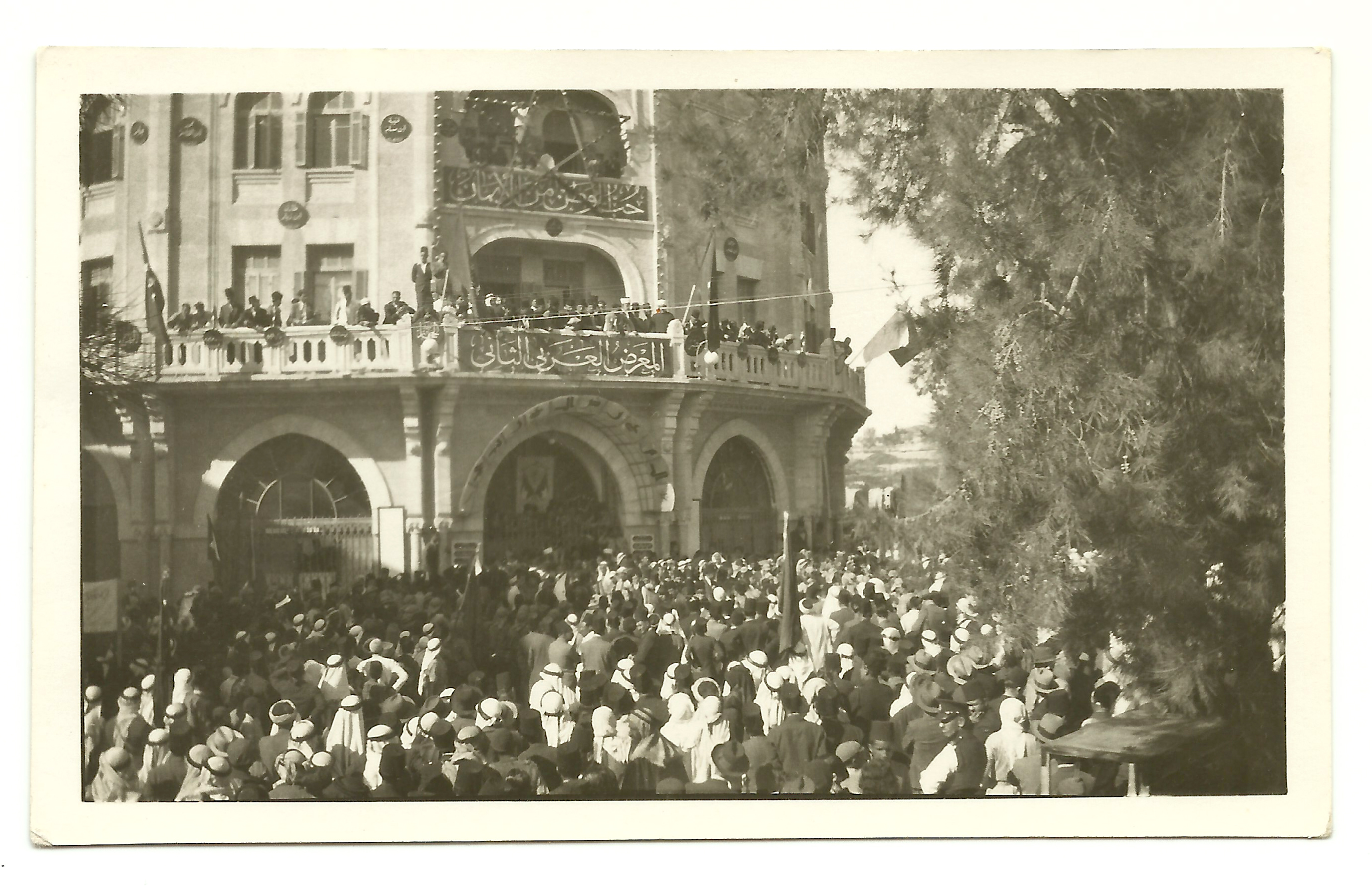 In July 1933, a large crowd from all over Palestine and even some neighboring Arab cities, gathered in Jerusalem in front of the Palace Hotel to attend the First Arab Exhibition. The exhibition—along with its second installment in 1934—sought to showcase and promote the latest Arab innovations, industries, products, crafts, and arts. Walking through the hallways of the Palace Hotel and into its rooms—which were repurposed as exhibition spaces—one would have found chocolate from Beirut, cigarettes from Haifa or Latakia, fragrances from Tripoli, soap from Nablus, blankets from Baghdad, leather works from Aleppo, carpets from Cairo, silk and cotton fabrics and garments from Damascus, Tatreez embroidery, and mother of pearl pieces from Bethlehem, as well as many other products from the Arab world, like oil paintings, metal works, furniture, and medicine. If visitors got tired walking around the exhibition halls, they could rest in the building’s garden cafe or attend a cinema screening or music performance in its theater on the upper floor. The Palace Hotel was not only the site where the exhibitions took place; it was itself on display in a way. Built in 1929 by the Supreme Muslim Council, it was a sign of Palestine’s modernity, and itself was one of the local innovations the Arab Exhibitions sought to celebrate.