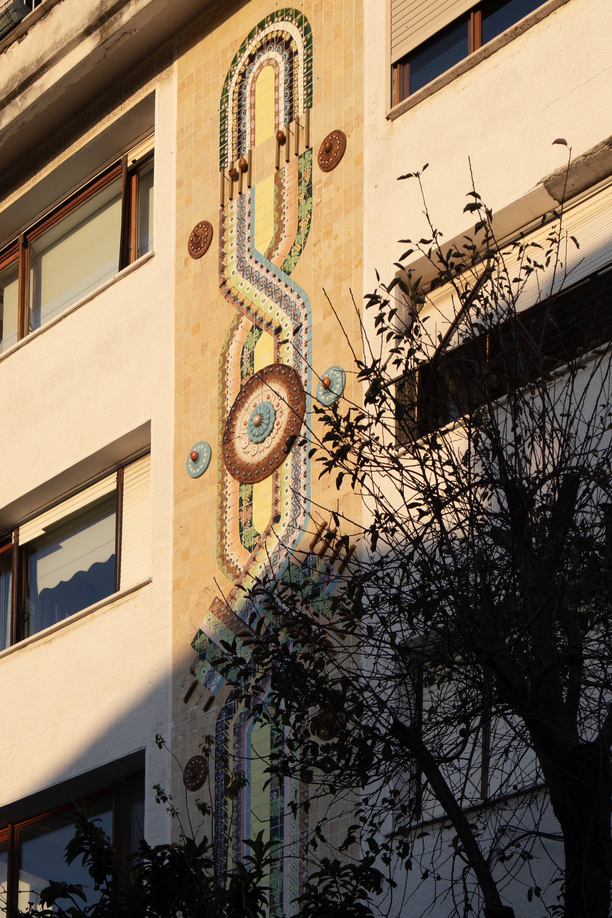 In winter 2023, I found my favorite building in Salacak bordered with corrugated steel panels.1 Corrugated steel is the first symptom of destruction. It is the local news breaker, simultaneously an obituary and a tombstone. In this coastal neighborhood of Istanbul, constant transformation and development are expected, given the high value of the Bosphorus view. Here, within a ten-minute stroll, there is one demolition site for every five cats encountered. And there are many cats in Istanbul. My favorite building, architecturally speaking, wasn’t particularly significant: a typical concrete apartment block from 1989, with waist-high windows and a dull, light brown plasterwork on its façade. Still, in contrast to contemporary design in Turkey, this building—like others, constructed at the same time, no matter how small, illegible, or haphazard—carried a certain aspiration for nuance. In some modest, gaudy, or experimental way, and with a sort of dignity, these buildings sought distinction. What made this apartment block meaningful to me were the two ceramic panels covering the length of its two façades. On these panels, kilim motifs, grapevine icons, and a variety of circular nodes were arranged in festive colors, with a quasi-futuristic undertone. Perched on one of Salacak’s many hilly streets, the building would glimmer in the evenings, when the sunset hit the glazed tiles. In the months following its demolition, I often took long detours to avoid the site.