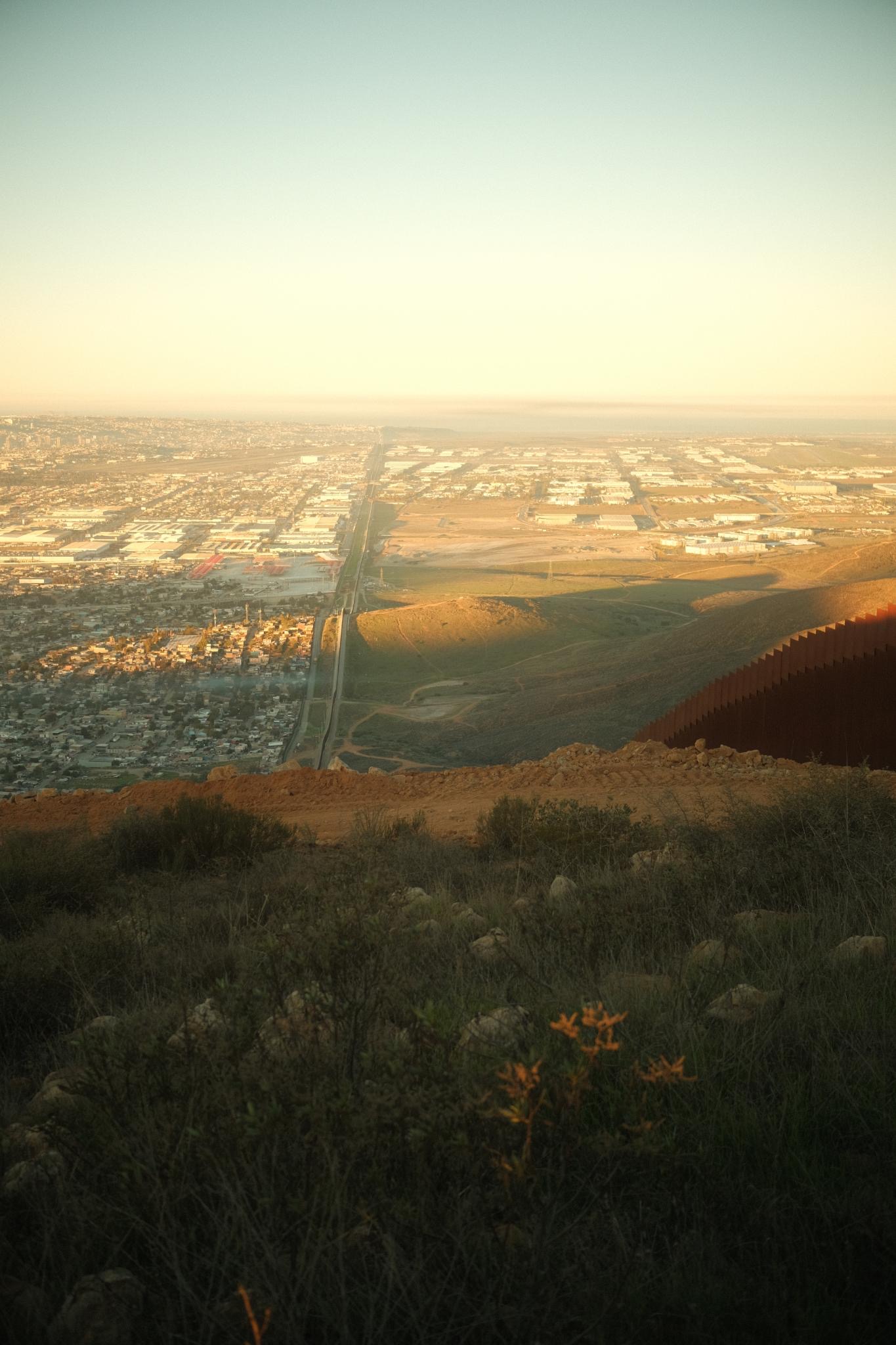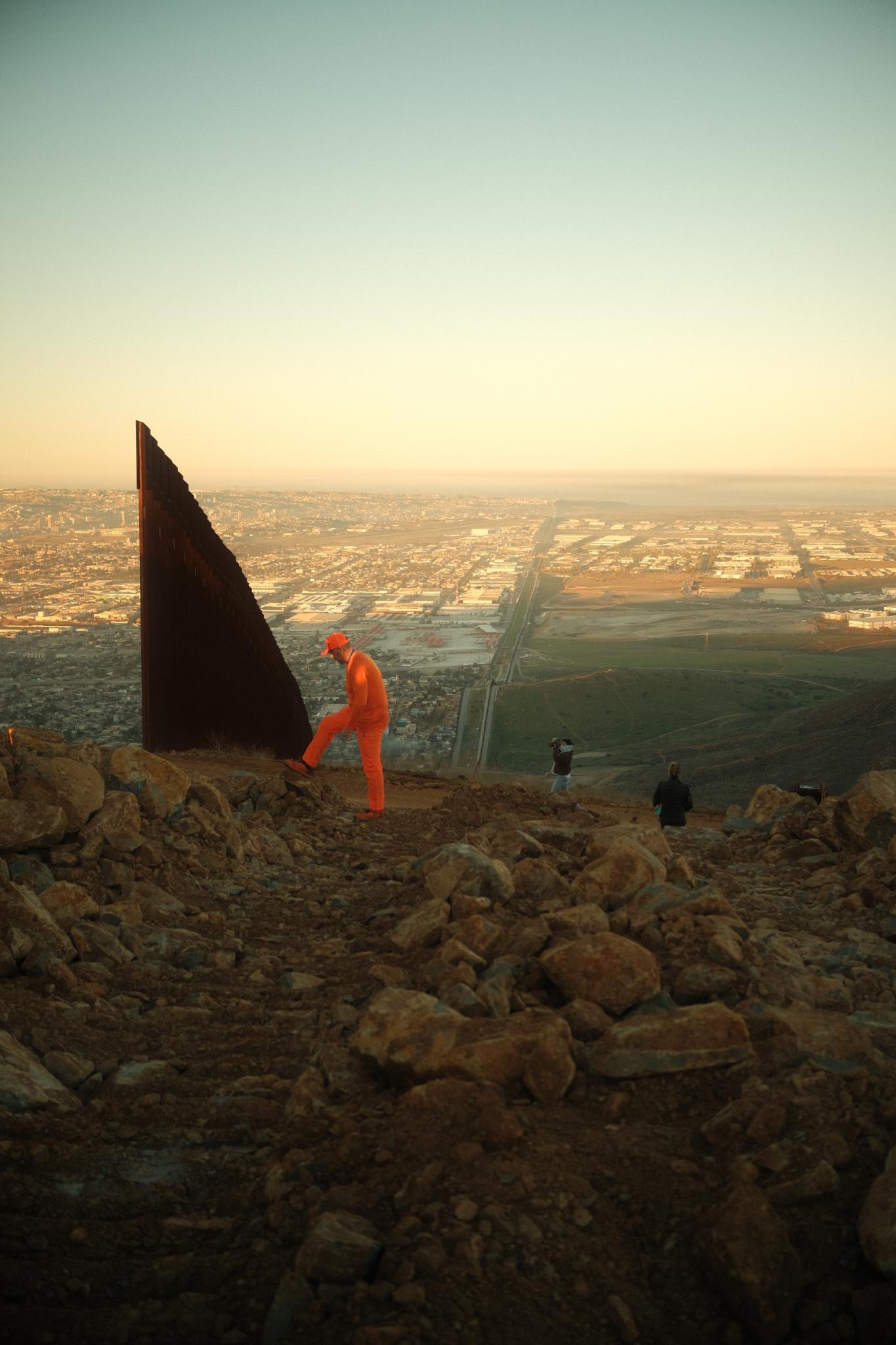 Dawn broke over the border wall in shards as we rode in between two fences up sinuous Otay Mountain roads. The barely there sunshine, a rhythm. It yanked itself between the railing of the walls with a strobe effect. It reminded me of structural film,11 where the screen flashes so intensely, it’s physical. Squinting hard against the flicker, we could barely see as we wound up the mountain. The landscape had impairment12 built into it, the physical sensation of being there rife with hostility. We paused at a clearing. The landscape was scorched orange, heat sweeping the viewshed against faded denim skies. The vantage point opened over the 800-acre detention supersite on the Otay Mesa. It houses the for-profit Otay Mesa Detention Center, run by CoreCivic,13 as well as the California State Richard J. Donovan Correctional Facility, the county George Bailey Detention Facility, and the East Mesa Juvenile Detention/Reentry Facility. Despite the density of carceral infrastructure, the US side of the border was relatively bare. By contrast, the architectural consumption and maquiladora sprawl of the Mexican side consumed the landscape. There was life right up to the edge. The view was gross in its beauty, heavenly in the way things you can’t touch are. Zooming out from the vista and in toward our boots, the terrain beneath our feet was grain brown and craggy, with deep gashes left from bulldozers and quarry trucks that moved exploded bedrock in the distance. Construction of the double border wall was still underway. Contractors continued their work, indifferent to us passing through.