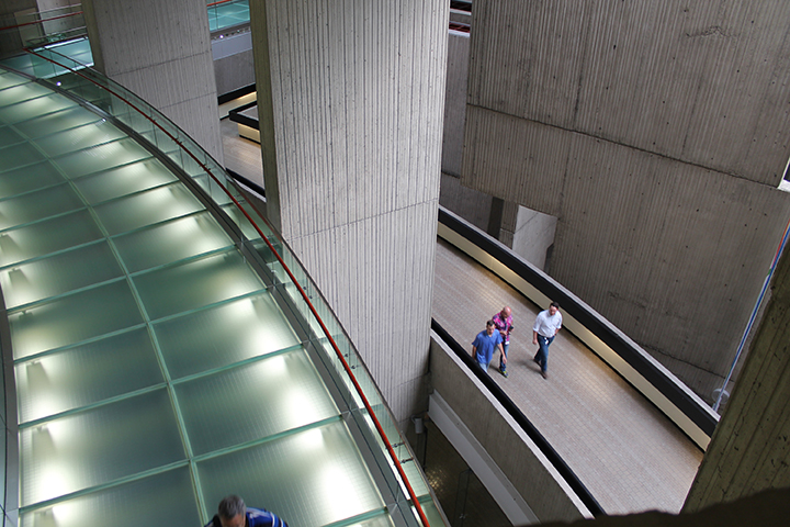 Drawing analogies across art forms is tricky work. We’ve all seen projects whose designer tries to translate the structure or techniques of a piece of music into architecture. That’s not what I intend to do here. But as I’m walking the RenCen this time, I’m trying to understand how this building makes me feel the way that these musics do—the likes of which, of course, didn’t quite exist when it was built (and even if they had, I am not so sure that Portman would have been a fan). The observers of the Portman atrium all hinted at this sensation—what Rice calls “a strange allure.” Reinhold Martin, building upon Jameson’s famous take in a 2008 lecture at the Berlage, specifically discussed the surreal effect of glass elevators:
